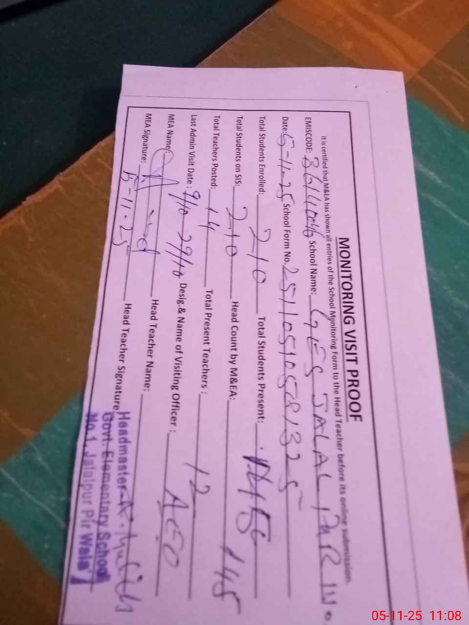 | Attendance Register | Head Teacher | MEA with School | Visit Proof |