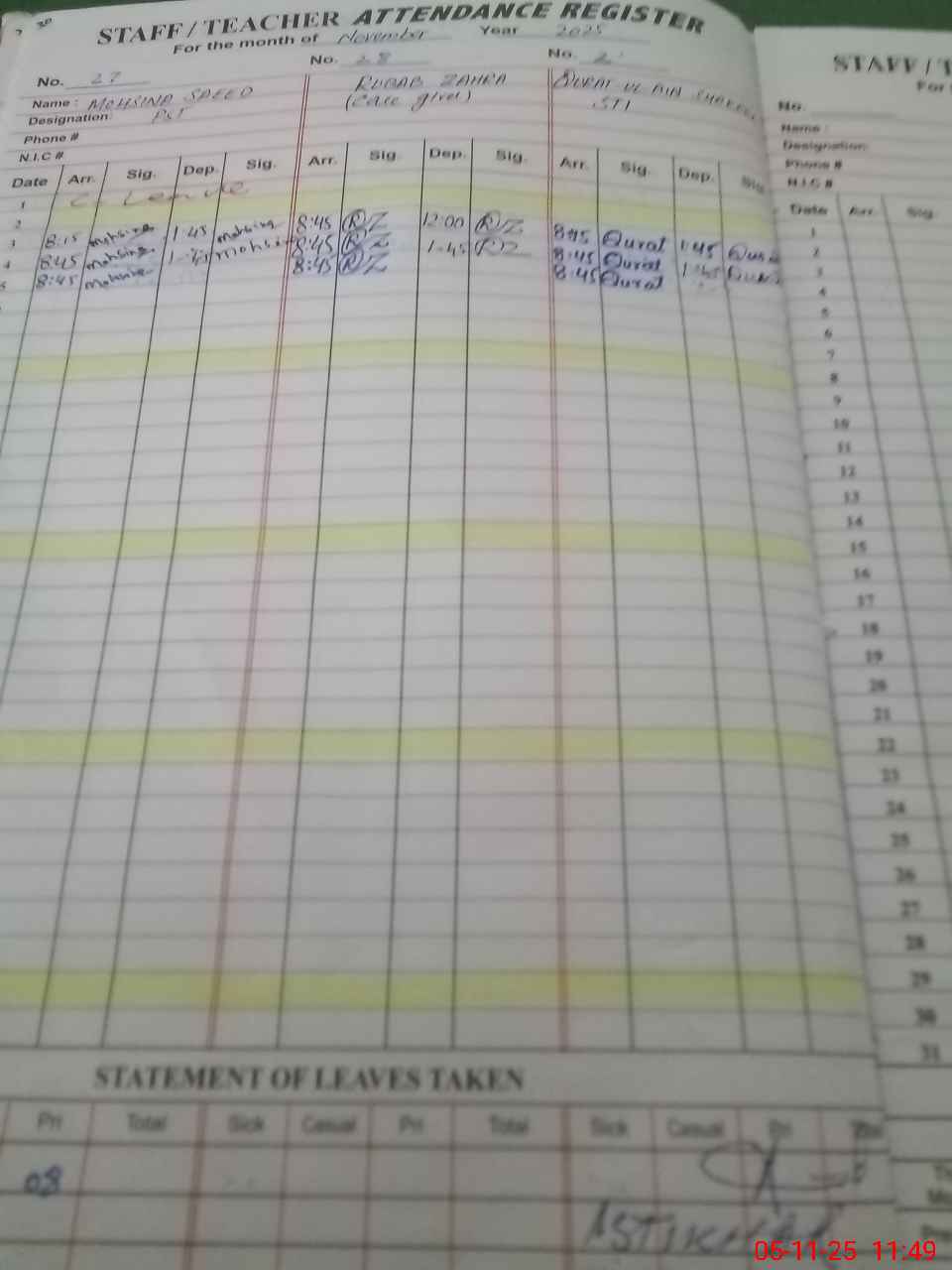 | CNIC | Full Name | Designation | R/C | Absence During Last Calender Month |