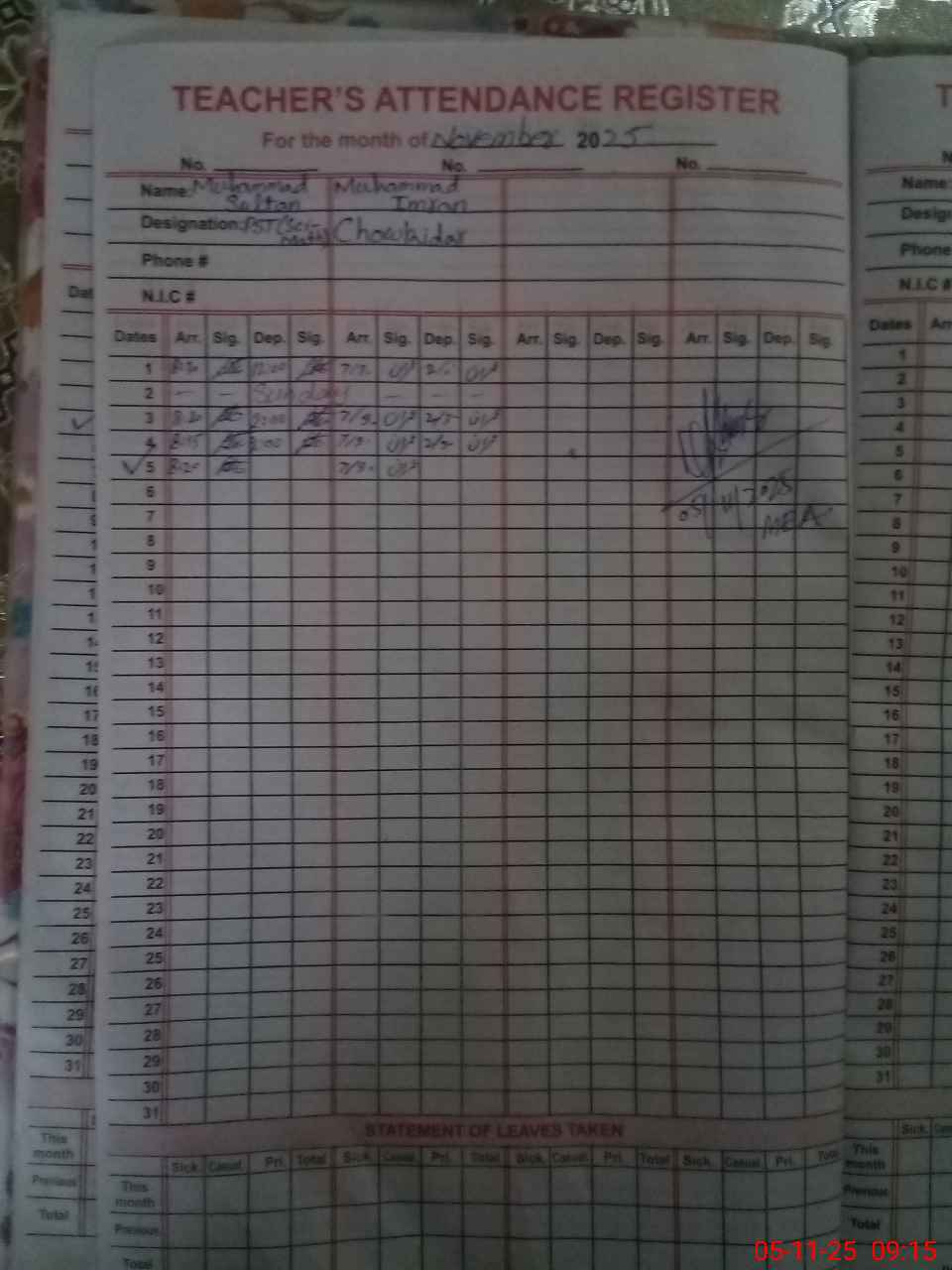 | CNIC | Full Name | Designation | R/C | Absence During Last Calender Month |