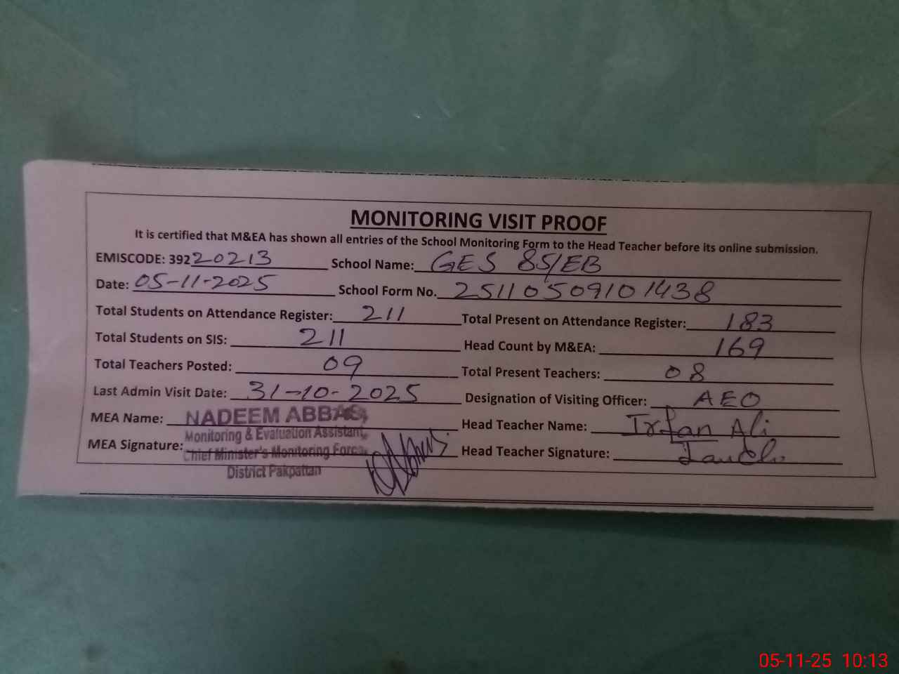 | Attendance Register | Head Teacher | MEA with School | Visit Proof |