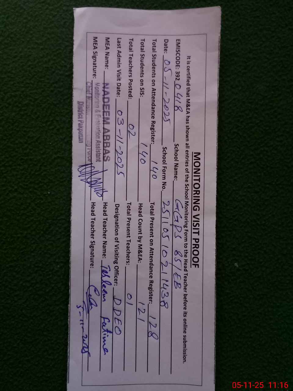 | Attendance Register | Head Teacher | MEA with School | Visit Proof |