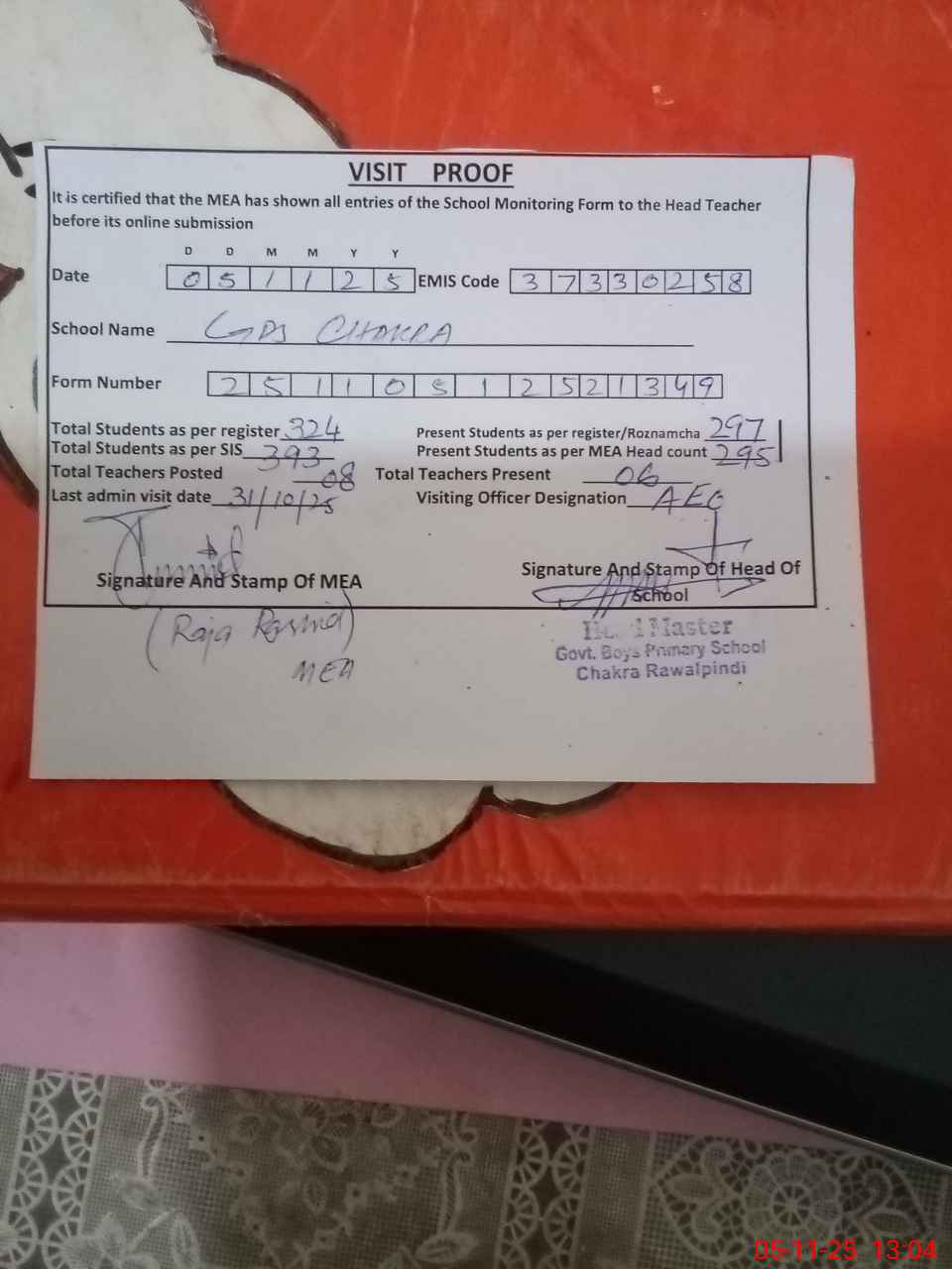 | Attendance Register | Head Teacher | MEA with School | Visit Proof |