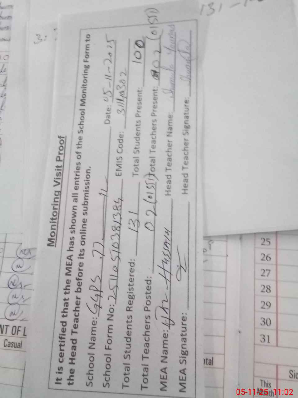 | Attendance Register | Head Teacher | MEA with School | Visit Proof |