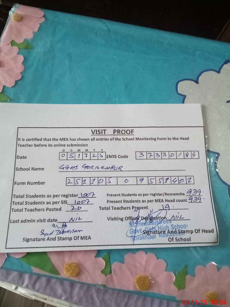 | Certified that this School was Inspected by the Undersigned MEA/DMO Today and the Information Stated Above is as Per Record. | |||||