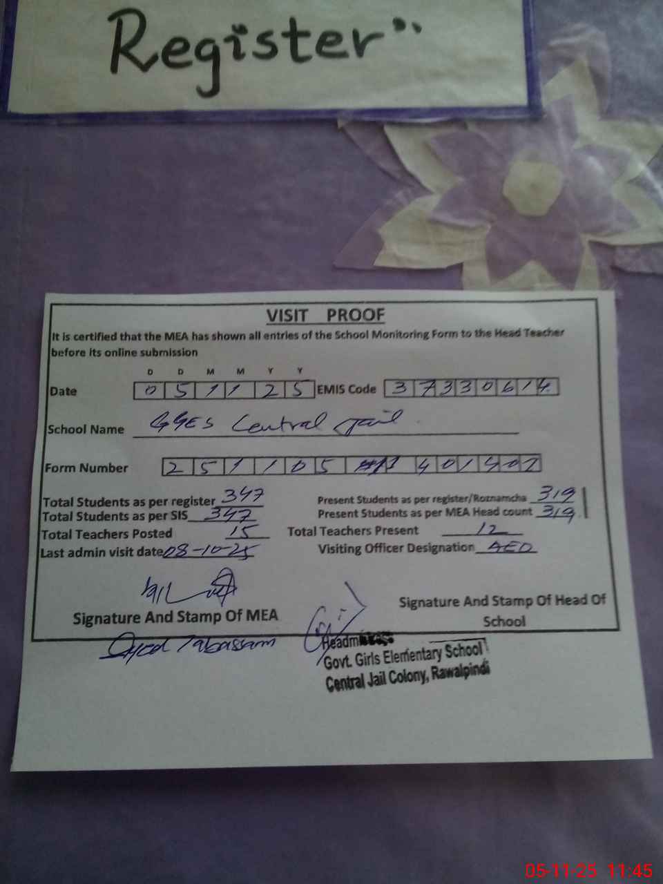 | Attendance Register | Head Teacher | MEA with School | Visit Proof |