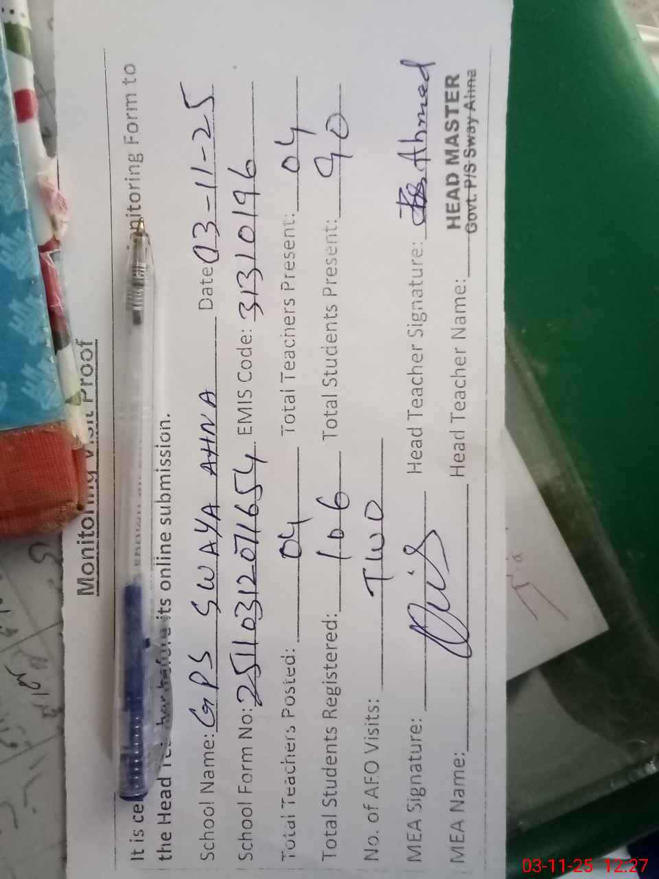 | Attendance Register | Head Teacher | MEA with School | Visit Proof |