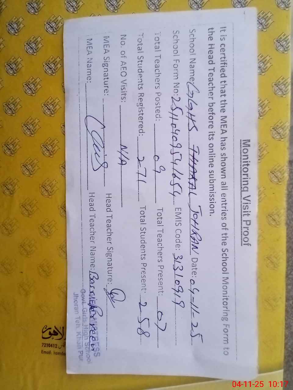 | EMIS Code: 31310919 | Name of School: GGHS JHORAN | |||