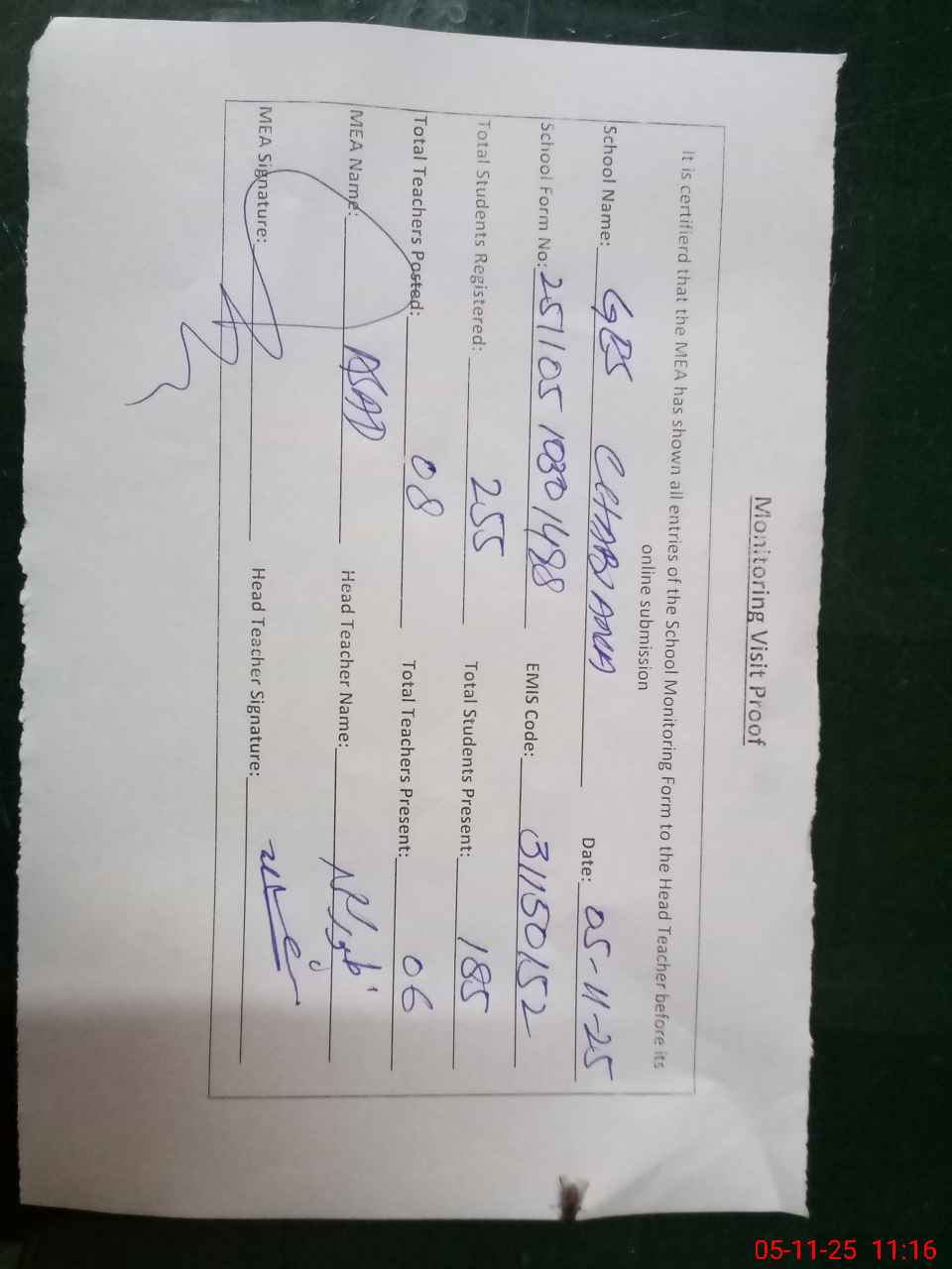 | Attendance Register | Head Teacher | MEA with School | Visit Proof |