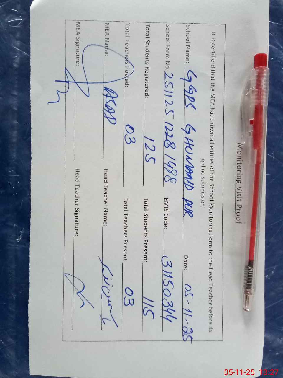 | Attendance Register | Head Teacher | MEA with School | Visit Proof |