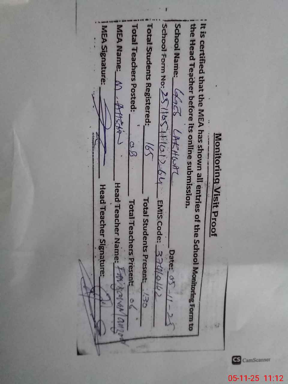 | Attendance Register | Head Teacher | MEA with School | Visit Proof |