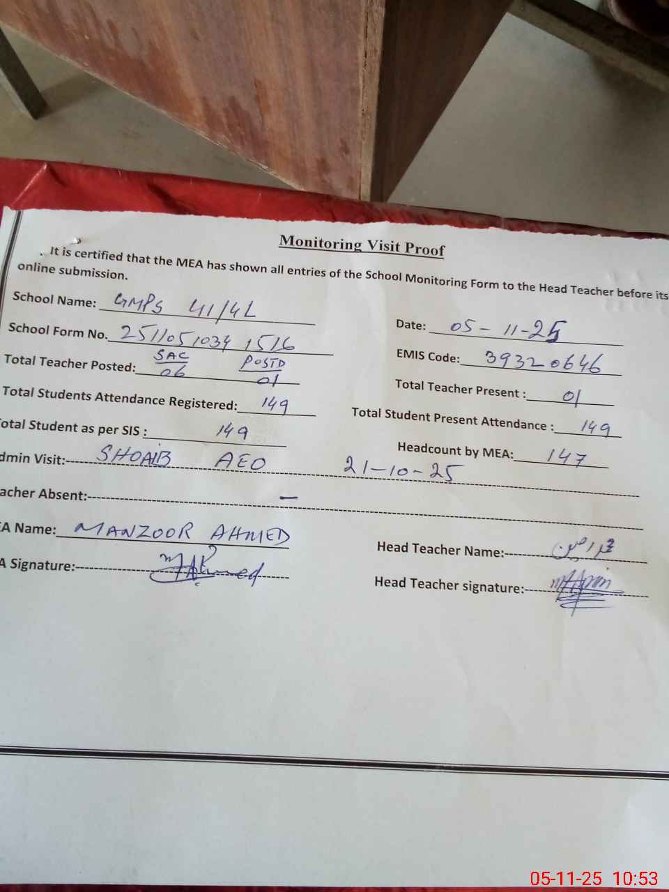 | Attendance Register | Head Teacher | MEA with School | Visit Proof |