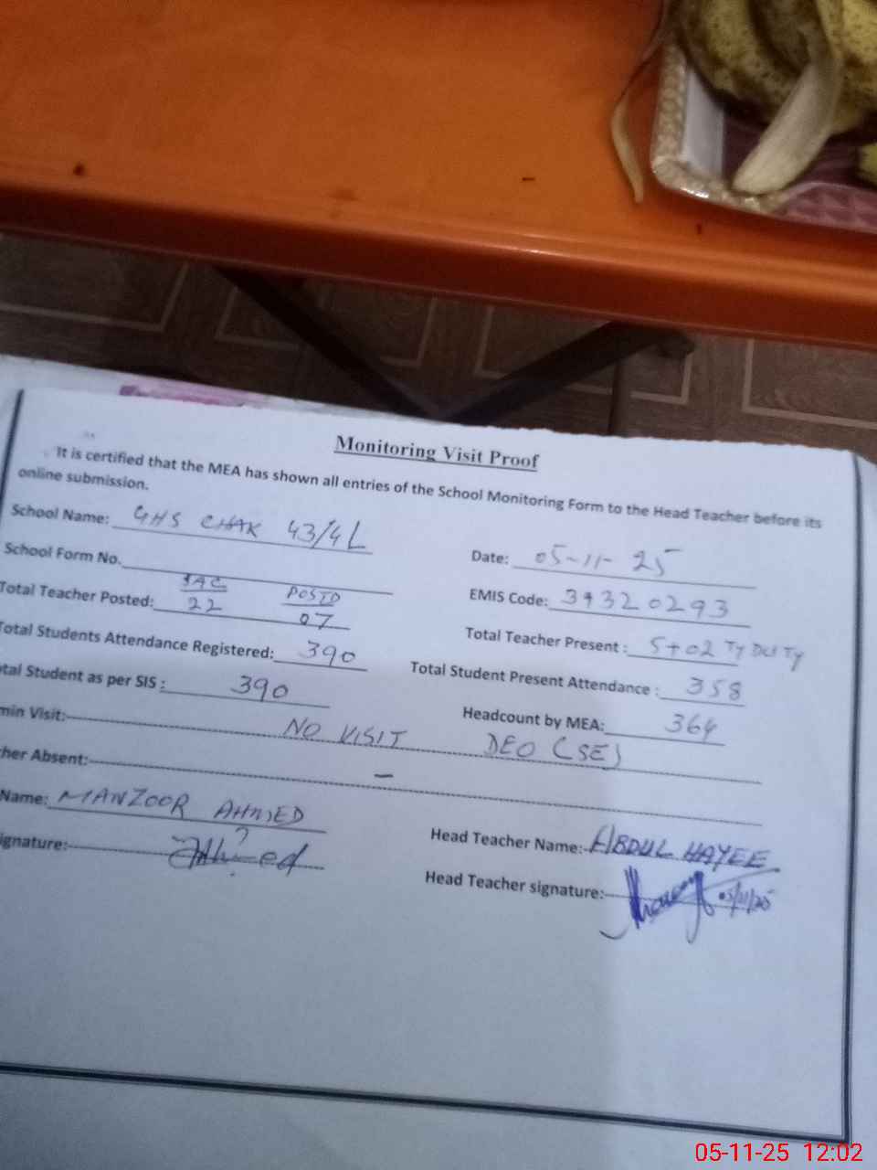 | EMIS Code: 39320293 | Name of School: GHS CHAK 43/4-L | |||