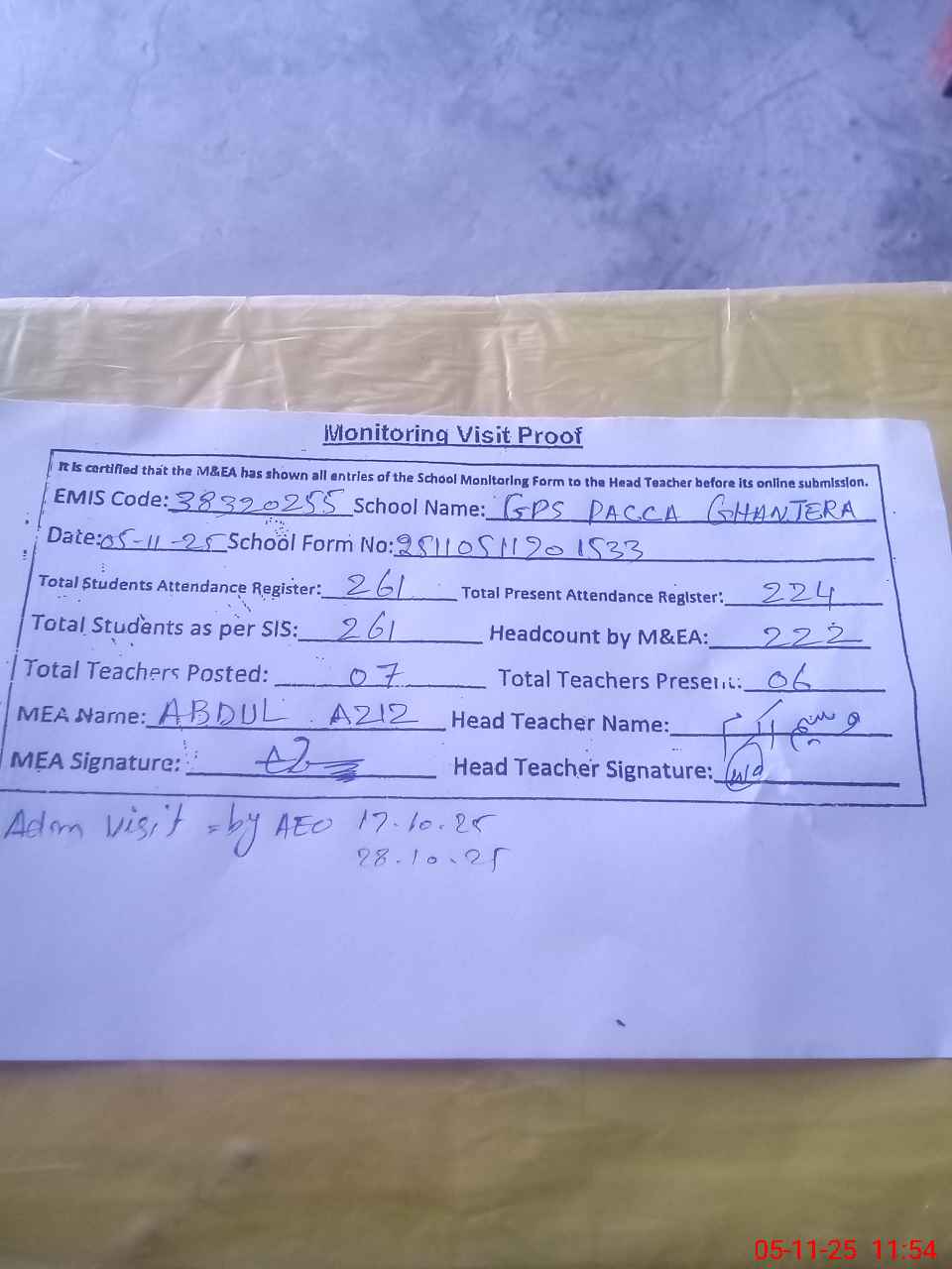 | Attendance Register | Head Teacher | MEA with School | Visit Proof |