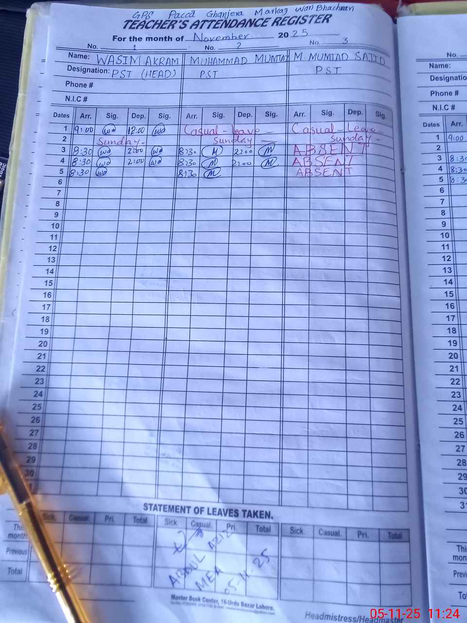 | CNIC | Full Name | Designation | R/C | Absence During Last Calender Month |