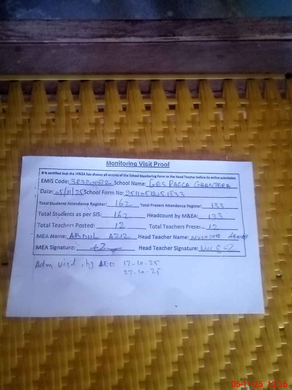 | Attendance Register | Head Teacher | MEA with School | Visit Proof |
