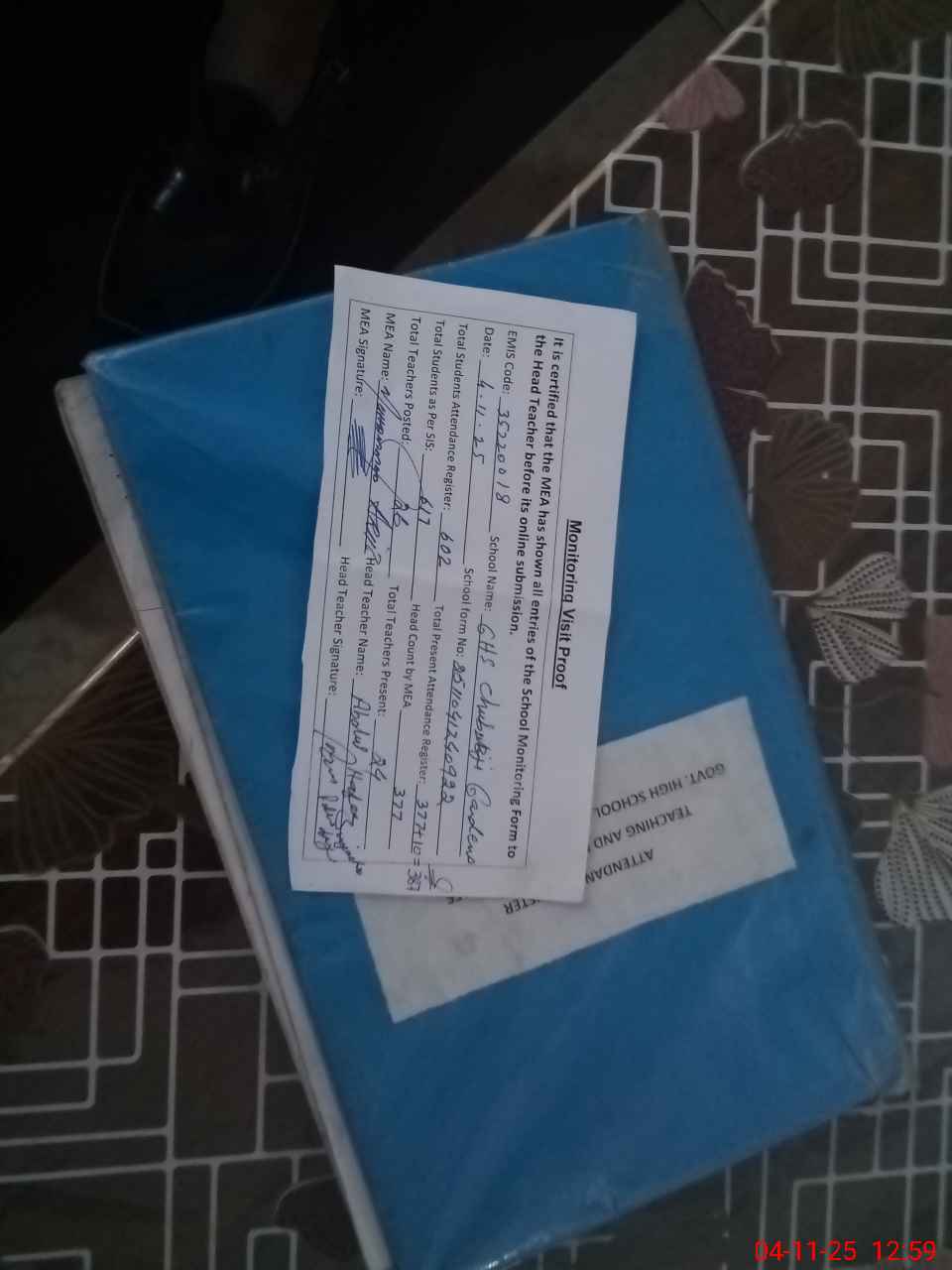 | Remarks (Use Separate Page if Required): Boundary wall Partially TOTAL STUDENT STRENGTH AS PER SIS 617 TOTAL STUDENT STRENGTH AS PER REGISTER 602 TOTAL STUDENT STRENGTH AS PER ROZNAMCH 377 PRESENT OUT OF 602 TOTAL STUDENT STRENGTH AS PER HEAD ACCOUNT 387 OUT OF 602 DIFFERENCE BETWEEN SIS AND ROZNAMCH 15 STUDENT 06 TOILETS ARE IN NOT FUNCTIONAL CONDITIONAL DUE TO SEVERAGE SYSTEM | |||||