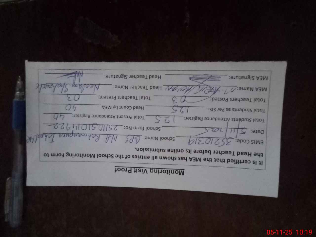 | Attendance Register | Head Teacher | MEA with School | Visit Proof |