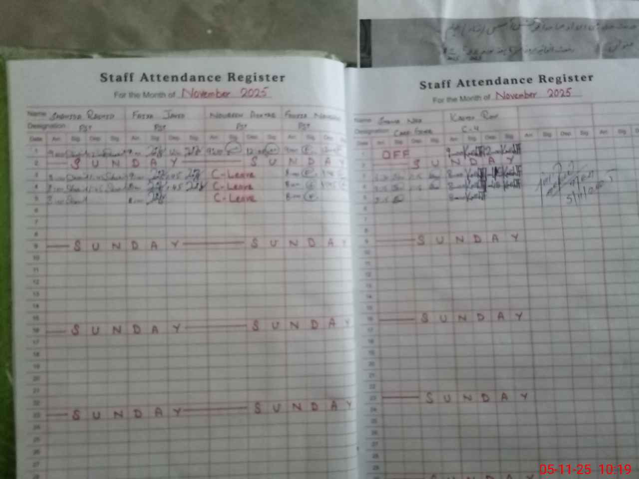 | CNIC | Full Name | Designation | R/C | Absence During Last Calender Month |