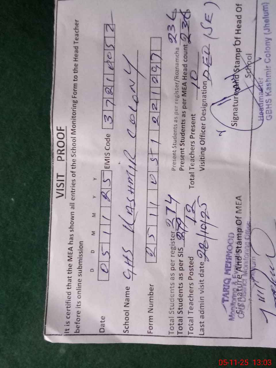 | EMIS Code: 37210052 | Name of School: GHS KASHMIR COLONY JHELUM | |||