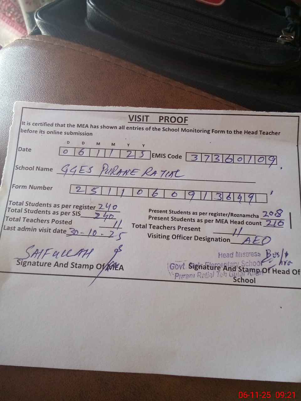 | Certified that this School was Inspected by the Undersigned MEA/DMO Today and the Information Stated Above is as Per Record. | |||||