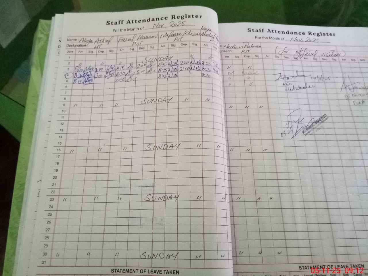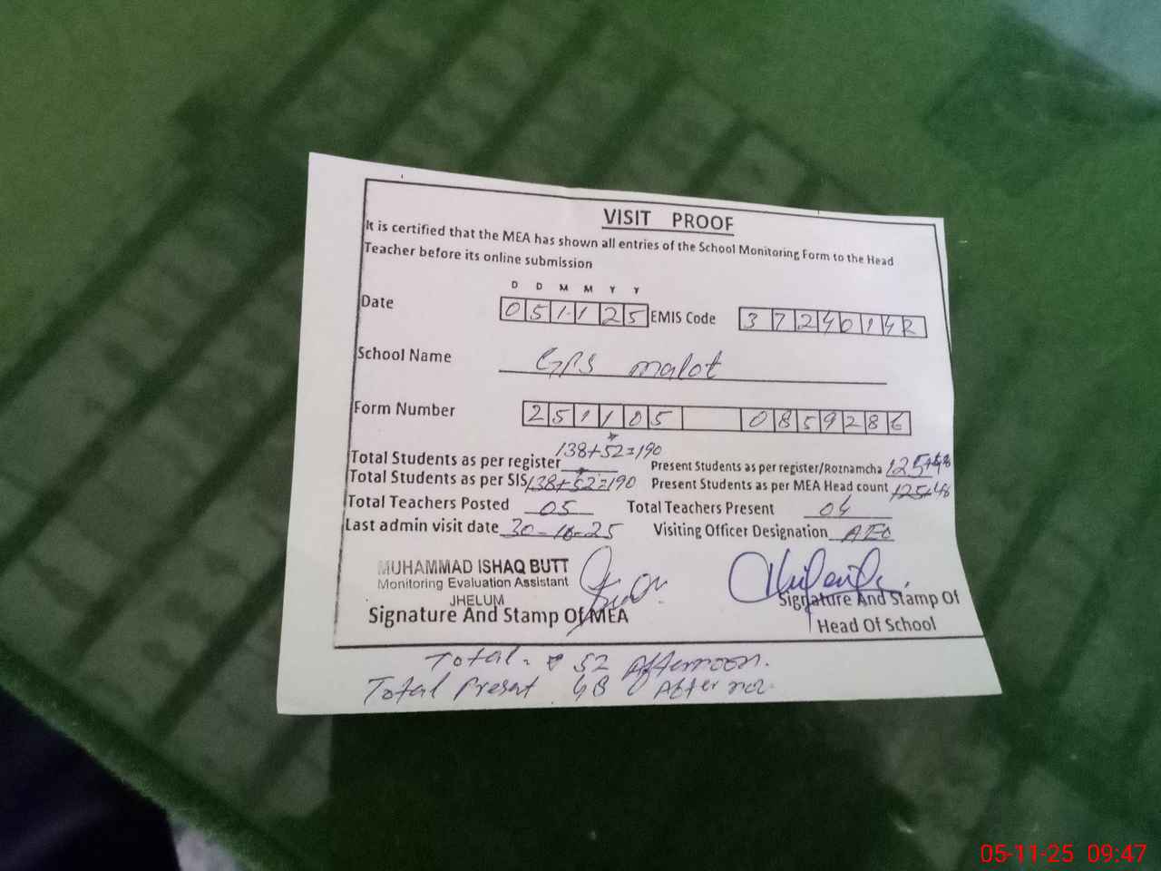 | Attendance Register | Head Teacher | MEA with School | Visit Proof |