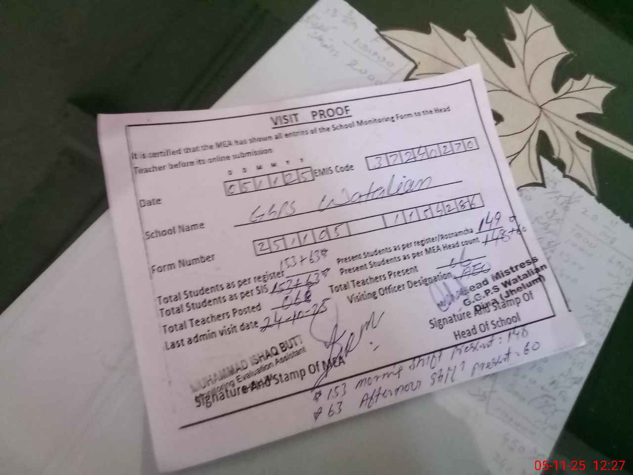 | Attendance Register | Head Teacher | MEA with School | Visit Proof |