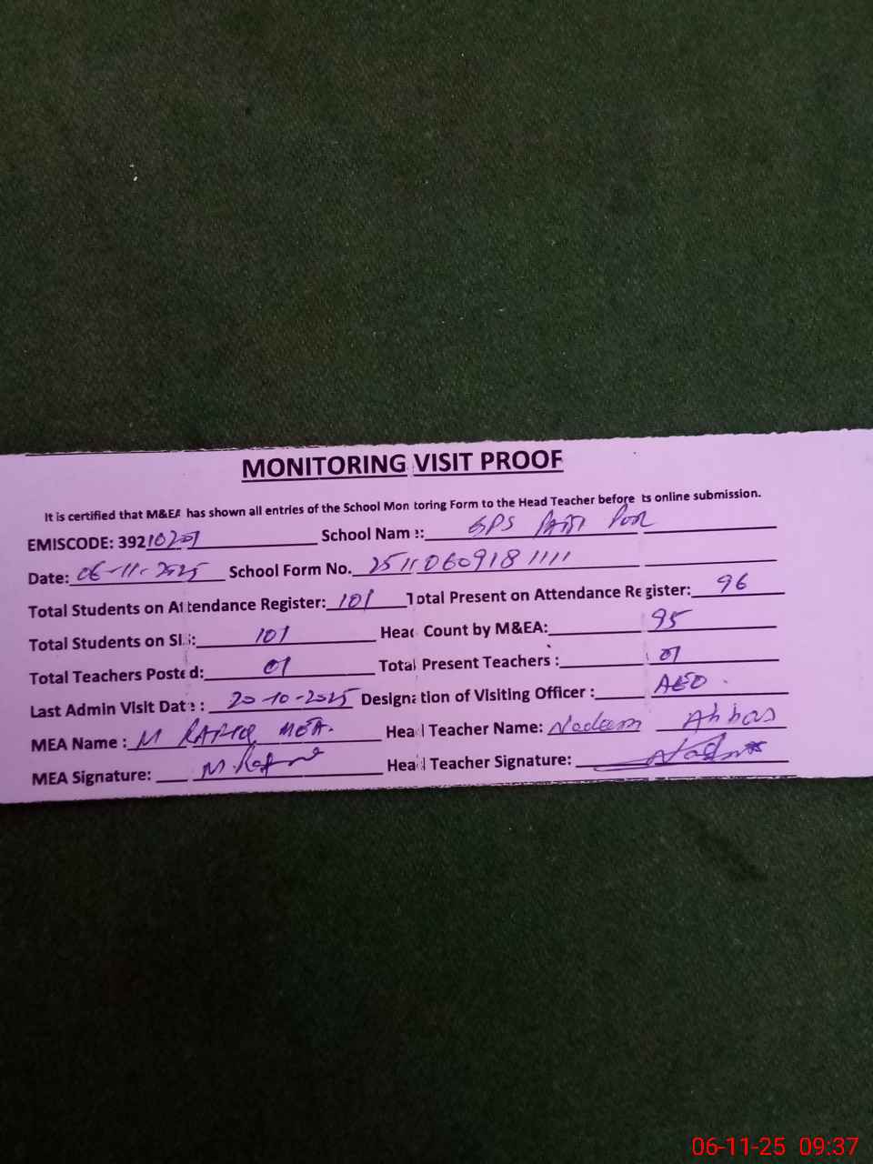 | Attendance Register | Head Teacher | MEA with School | Visit Proof |