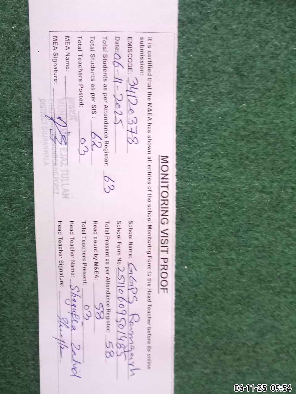 | Attendance Register | Head Teacher | MEA with School | Visit Proof |