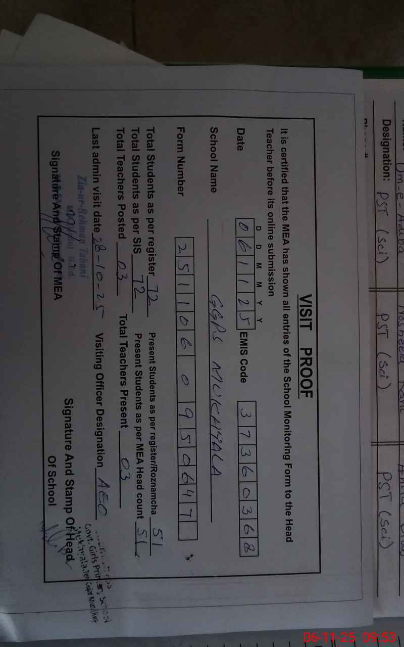 | Attendance Register | Head Teacher | MEA with School | Visit Proof |