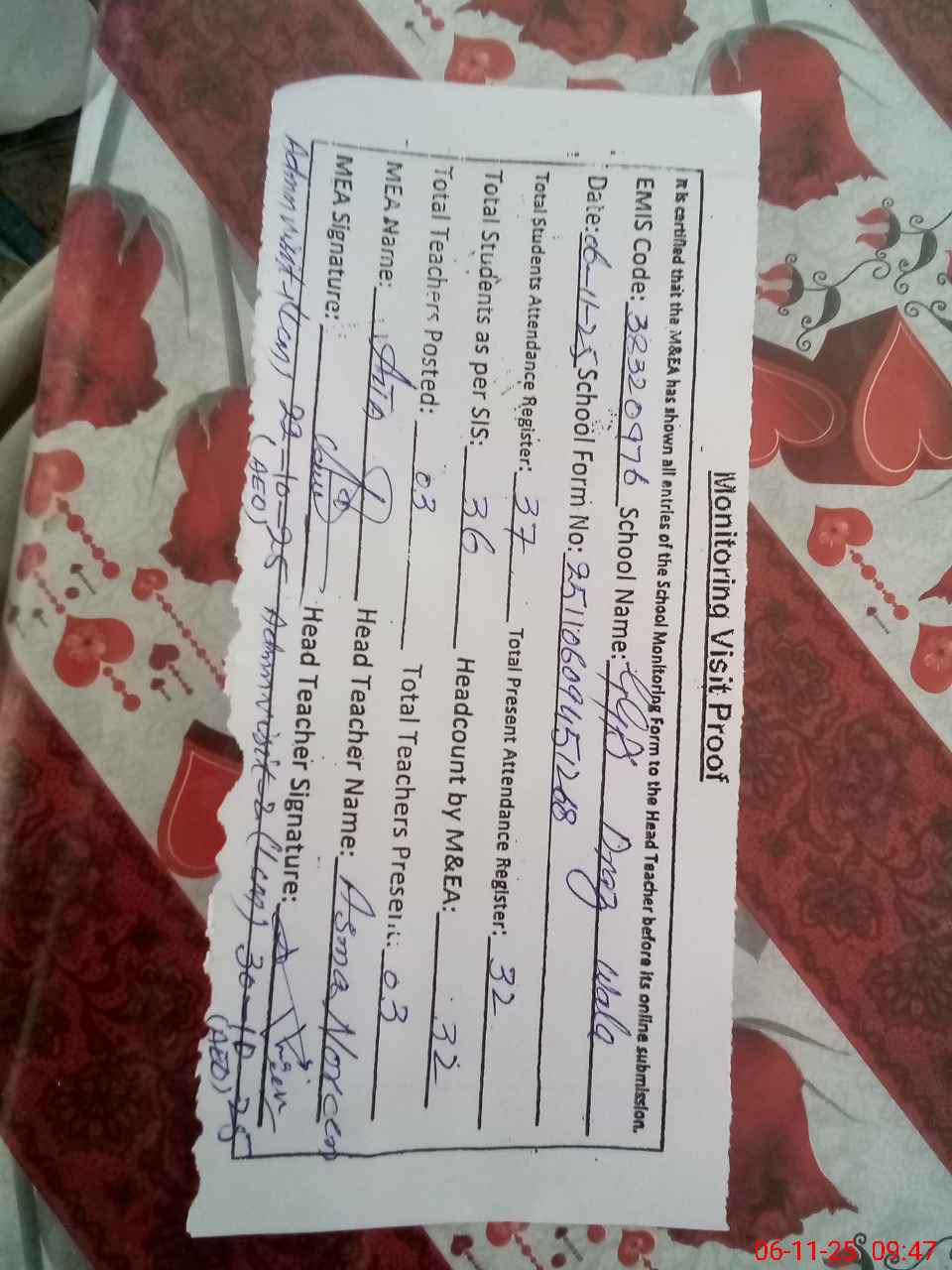 | Attendance Register | Head Teacher | MEA with School | Visit Proof |