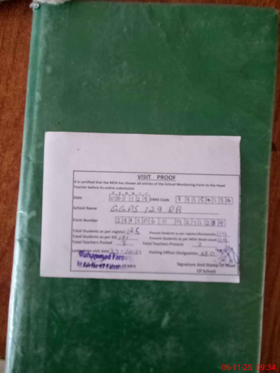 | Attendance Register | Head Teacher | MEA with School | Visit Proof |