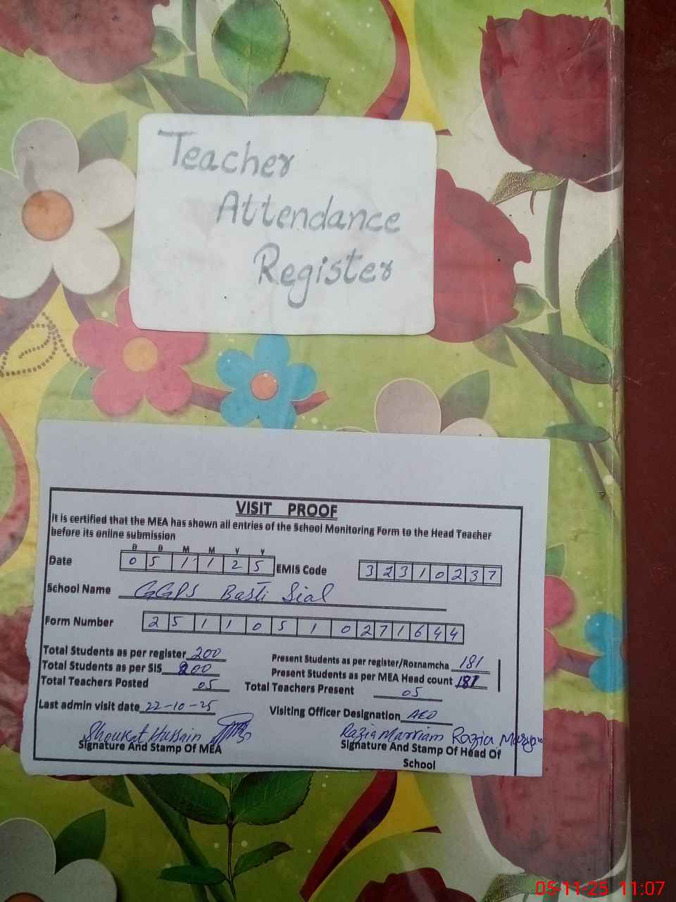 | Attendance Register | Head Teacher | MEA with School | Visit Proof |