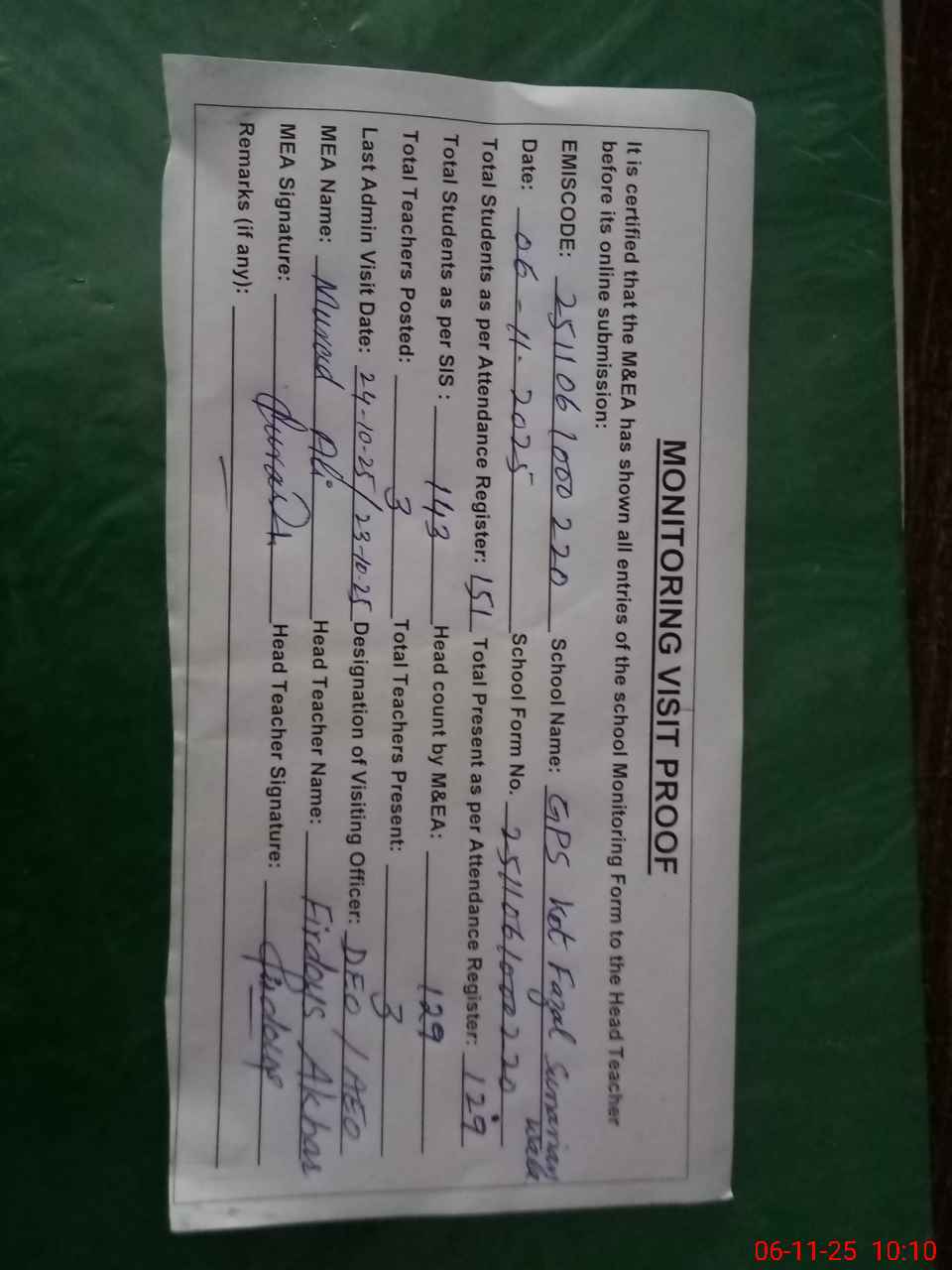 | Attendance Register | Head Teacher | MEA with School | Visit Proof |