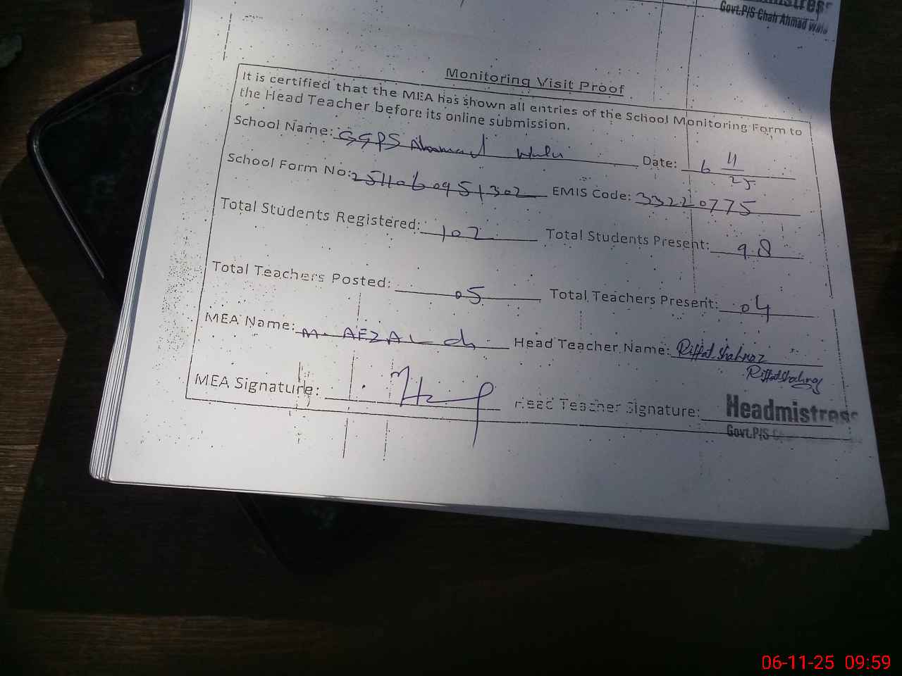 | Attendance Register | Head Teacher | MEA with School | Visit Proof |