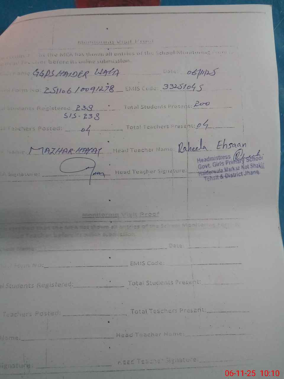 | Attendance Register | Head Teacher | MEA with School | Visit Proof |