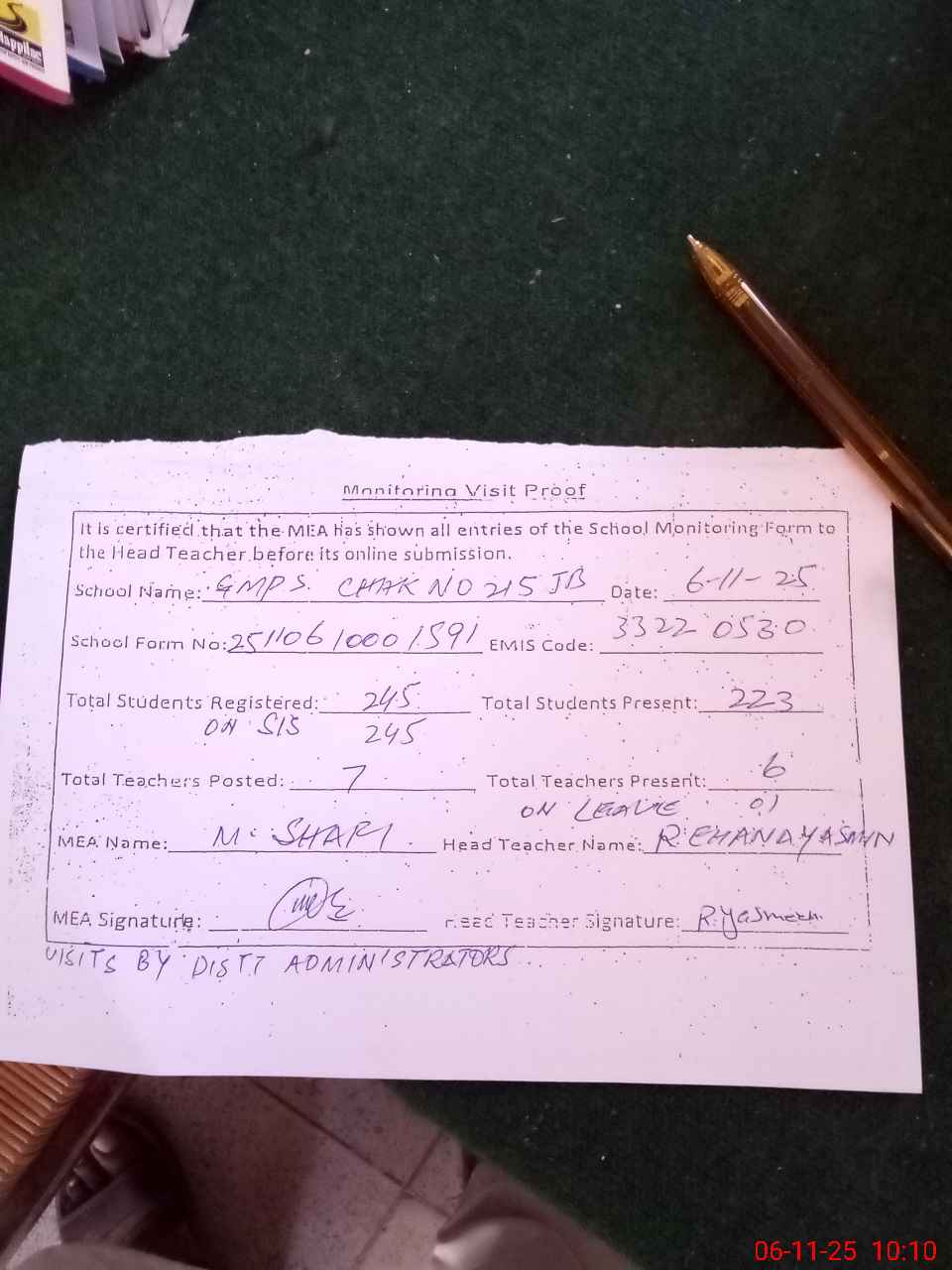 | Attendance Register | Head Teacher | MEA with School | Visit Proof |