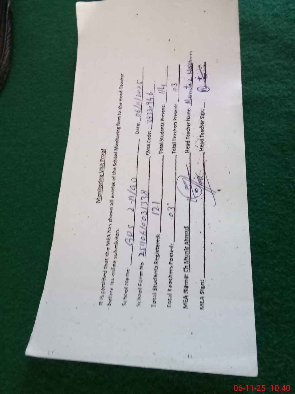 | Attendance Register | Head Teacher | MEA with School | Visit Proof |