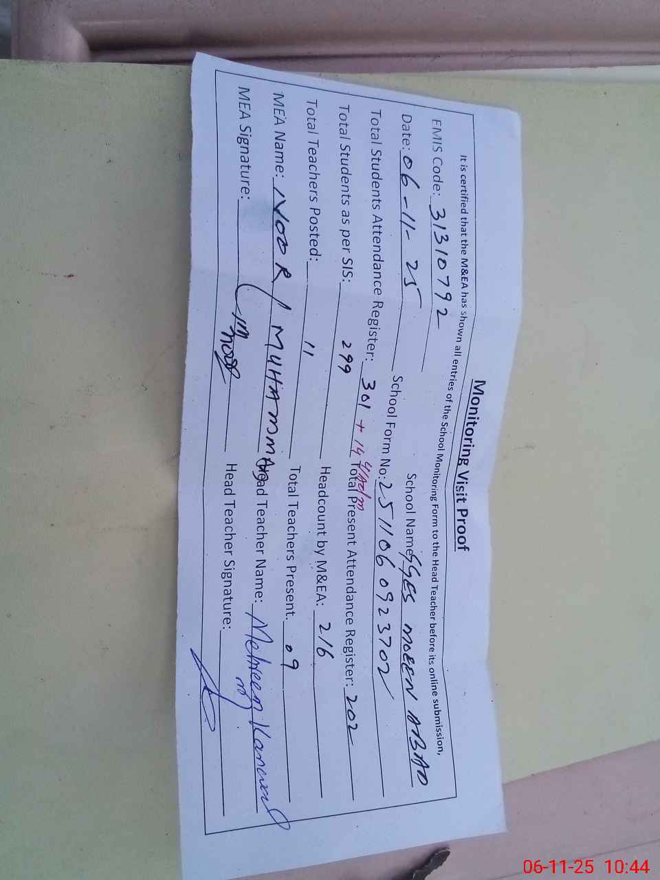 | Attendance Register | Head Teacher | MEA with School | Visit Proof |