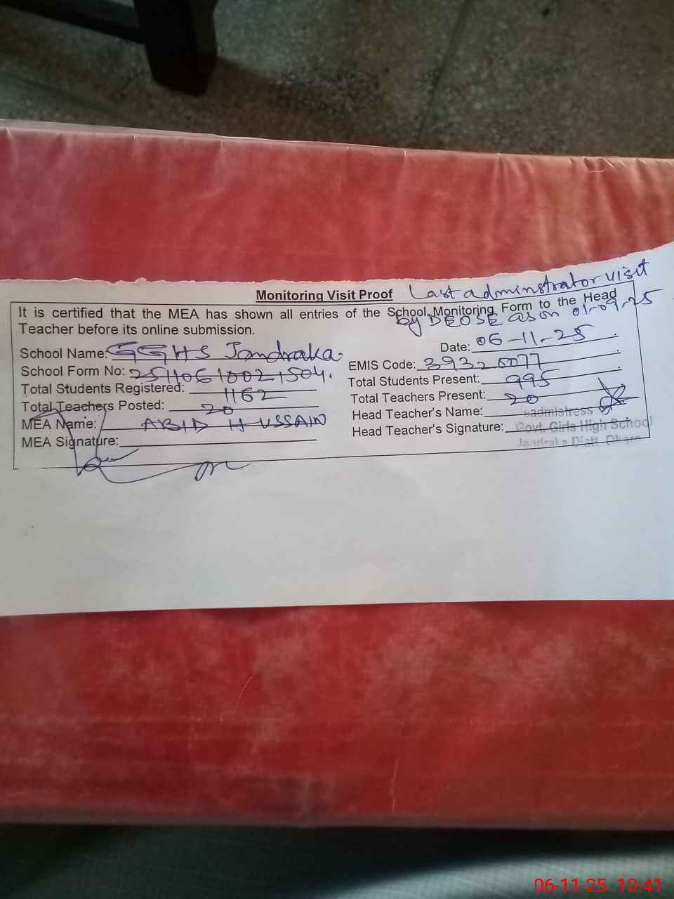| Attendance Register | Head Teacher | MEA with School | Visit Proof |