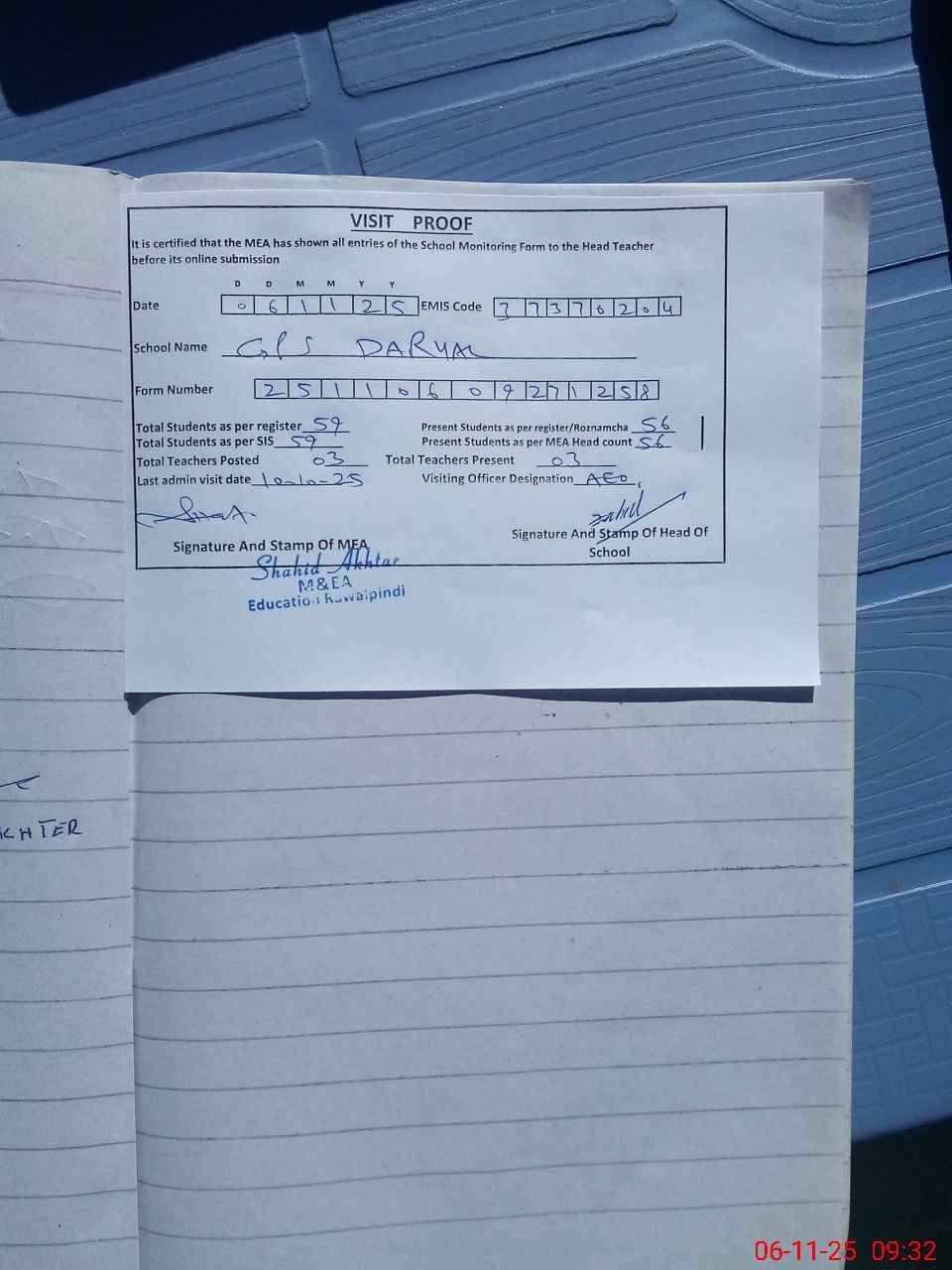 | Attendance Register | Head Teacher | MEA with School | Visit Proof |