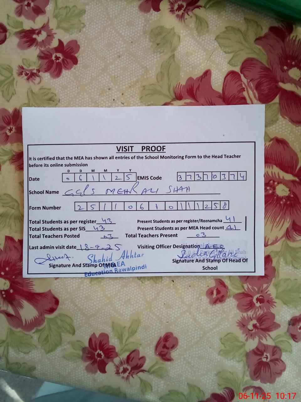 | Certified that this School was Inspected by the Undersigned MEA/DMO Today and the Information Stated Above is as Per Record. | |||||