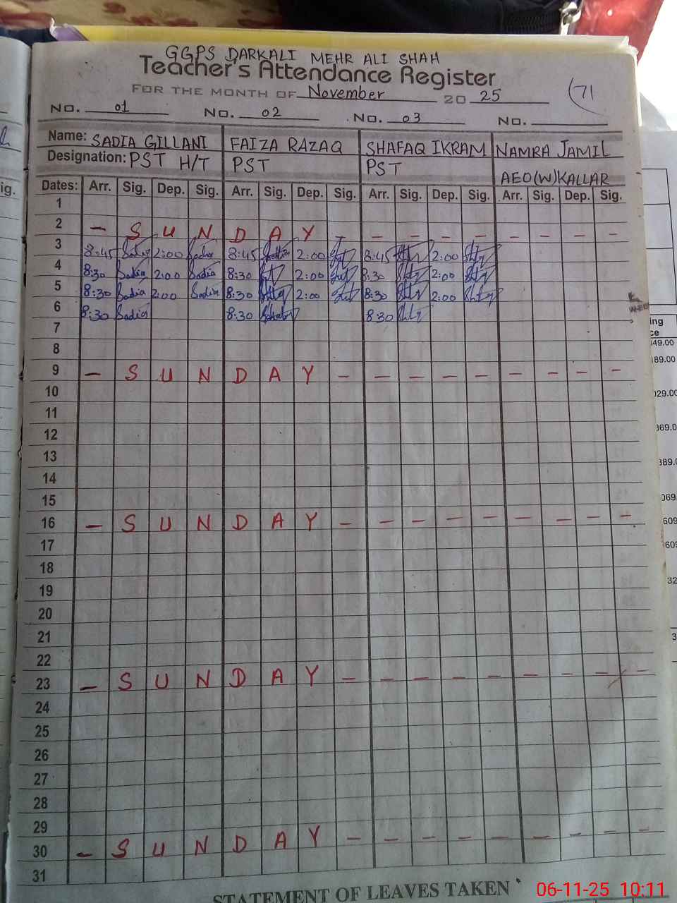 | Monitoring Date: 06-11-2025 | Start Time: 06-11-2025 09:59 AM | End Time: 06-11-2025 10:17 AM | Name of MEA: SH**** AK**** | |