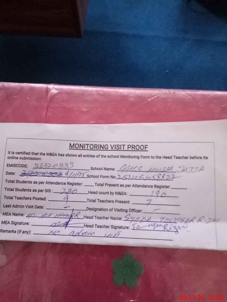 | Attendance Register | Head Teacher | MEA with School | Visit Proof |