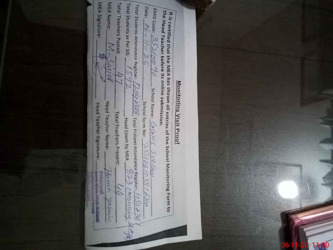 | Remarks (Use Separate Page if Required): PST Ayesha Ahmad has resigned on 30 Sep 2025 Total sanctioned posts of teachers are 53 AEO visited this school on 31 Oct 2025 A difference of 229 students found in Roznamcha and head count of morning shift only whereas second shift attendance is noted from roznamcha Present students percentage of morning shift is 68 percent One toilet found blocked 35210090 | |||||