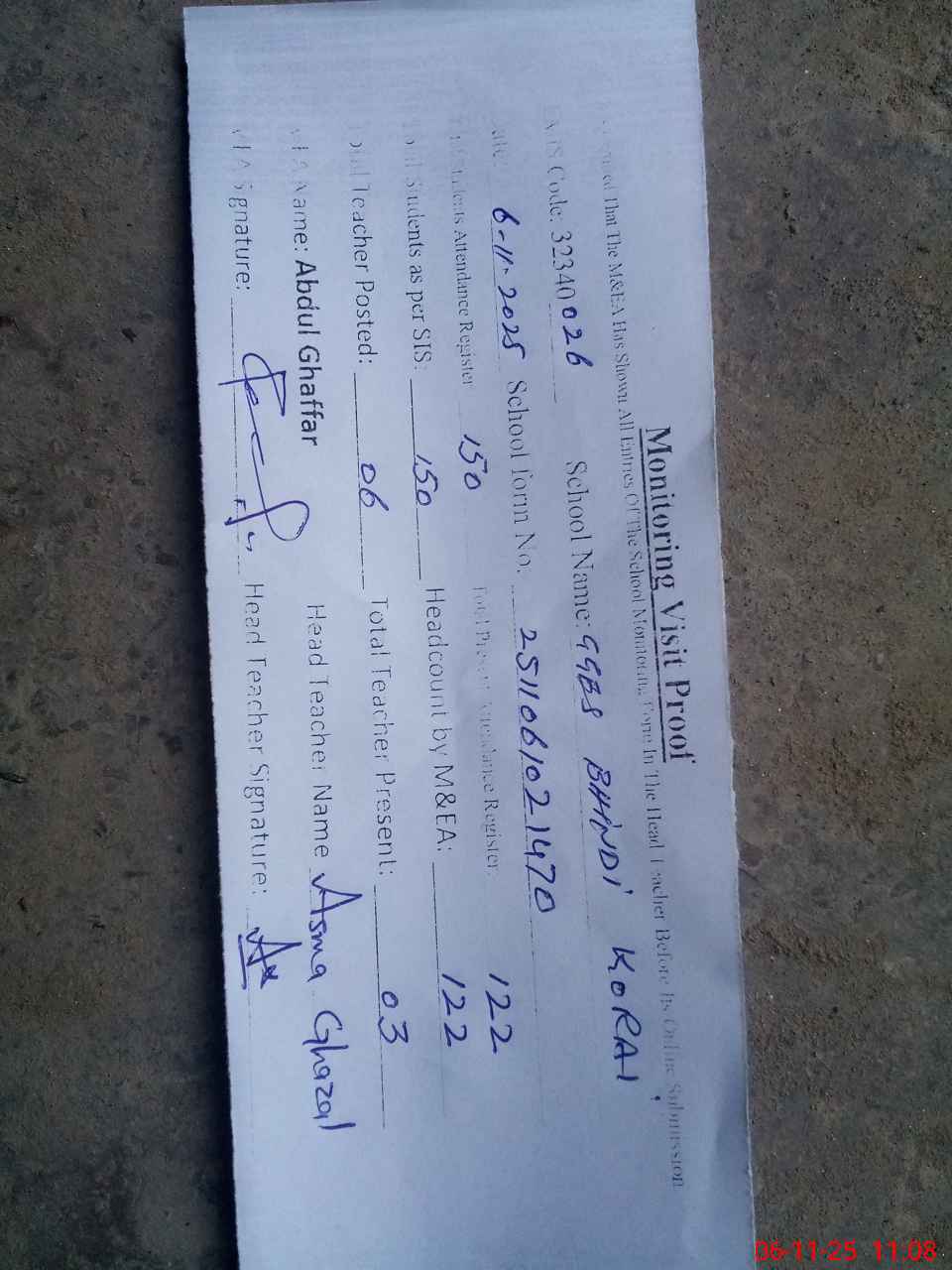 | Attendance Register | Head Teacher | MEA with School | Visit Proof |
