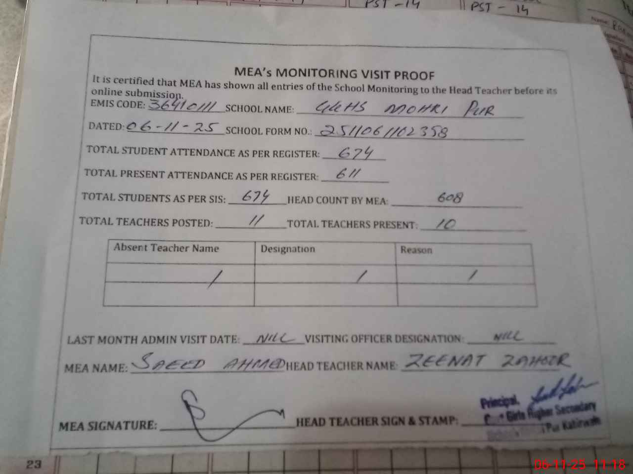 | Attendance Register | Head Teacher | MEA with School | Visit Proof |
