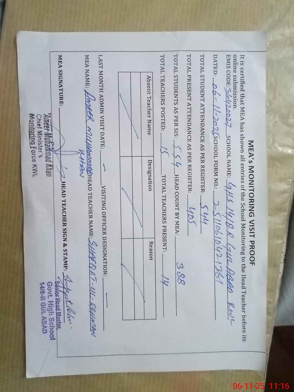 | Monitoring Date: 06-11-2025 | Start Time: 06-11-2025 09:22 AM | End Time: 06-11-2025 11:19 AM | Name of MEA: Am**** Mu**** Kh**** | |