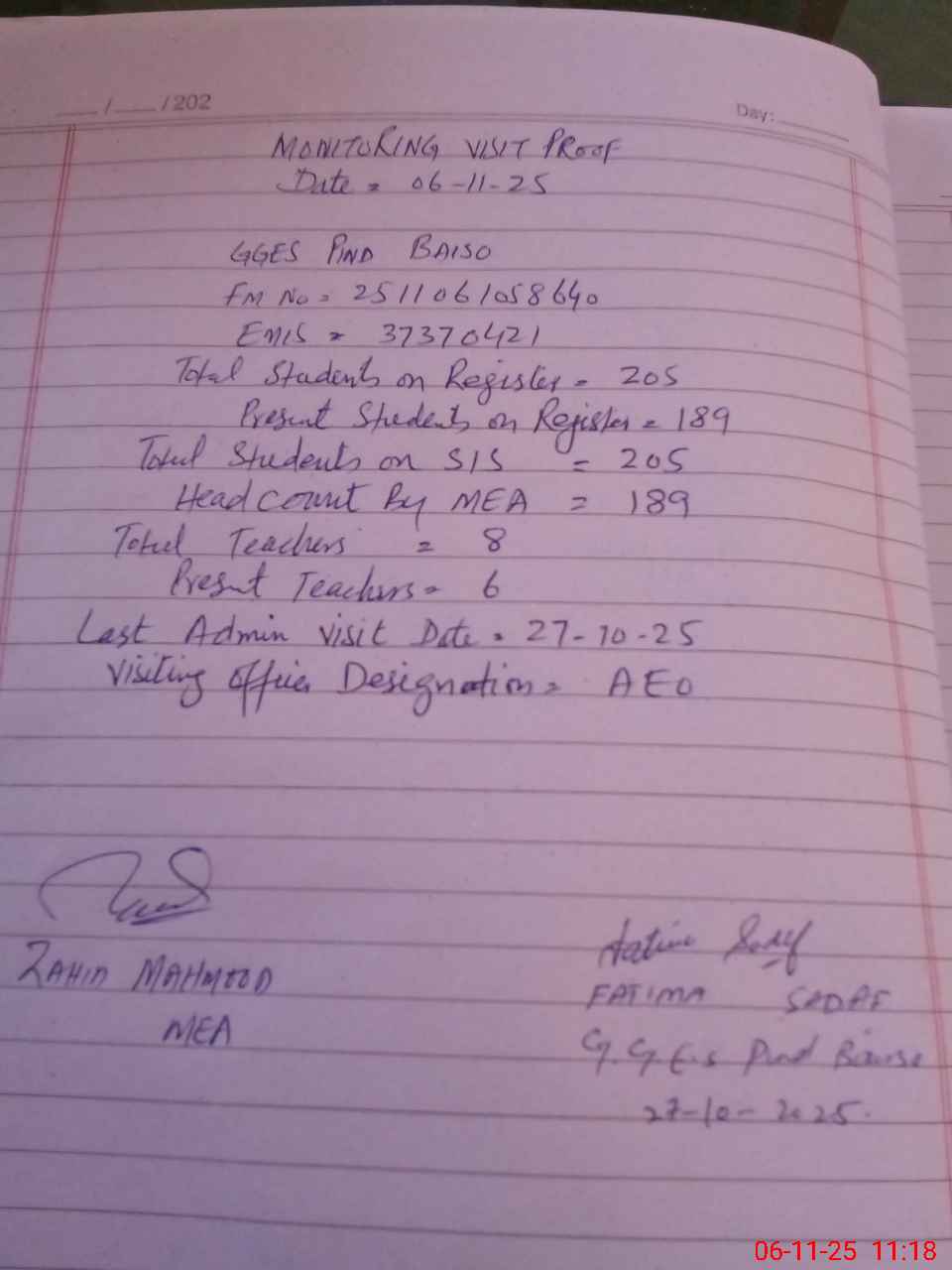 | Monitoring Date: 06-11-2025 | Start Time: 06-11-2025 10:53 AM | End Time: 06-11-2025 11:21 AM | Name of MEA: Za**** Me**** | |