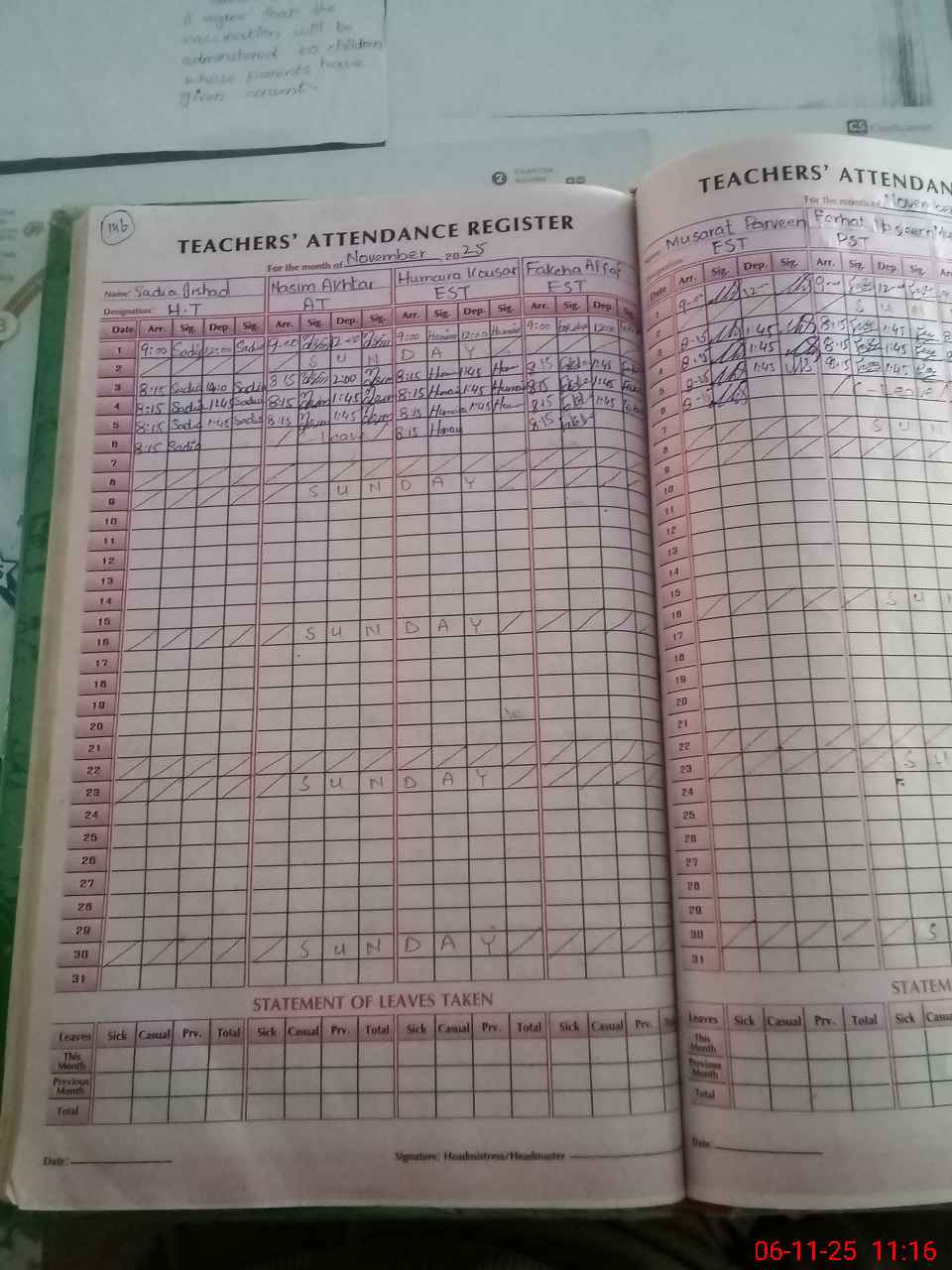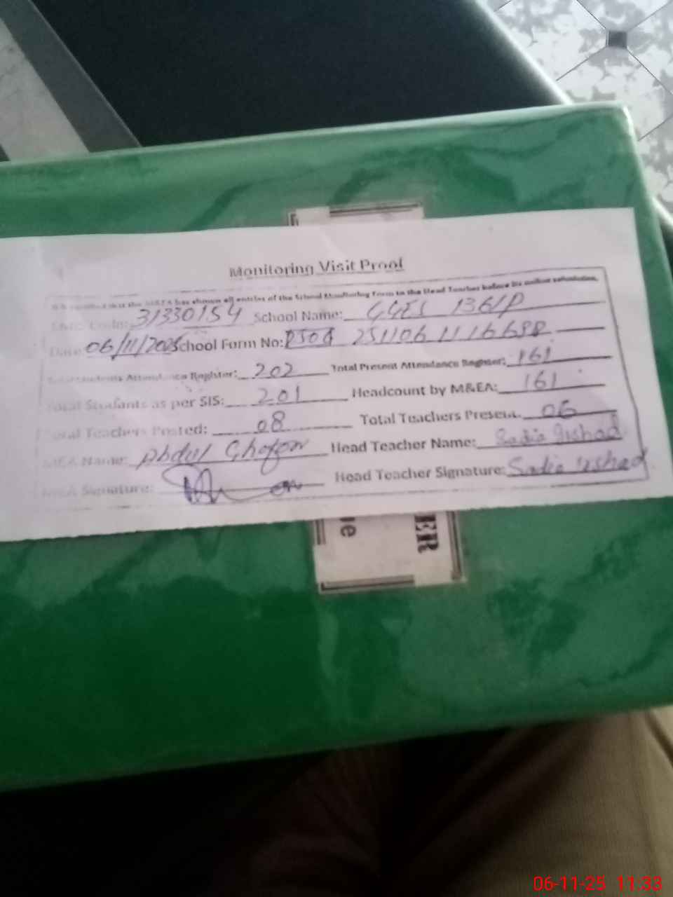 | Attendance Register | Head Teacher | MEA with School | Visit Proof |