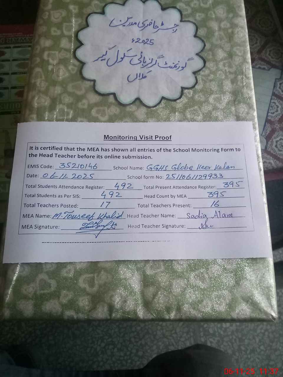 | Attendance Register | Head Teacher | MEA with School | Visit Proof |